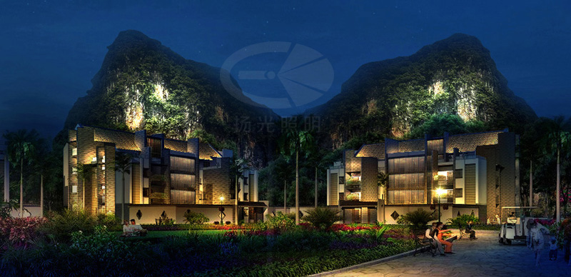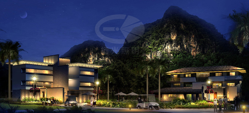 入口山體“樂養(yǎng)”字體標識,使用4組4*1200W暖白光立桿投光燈照亮。