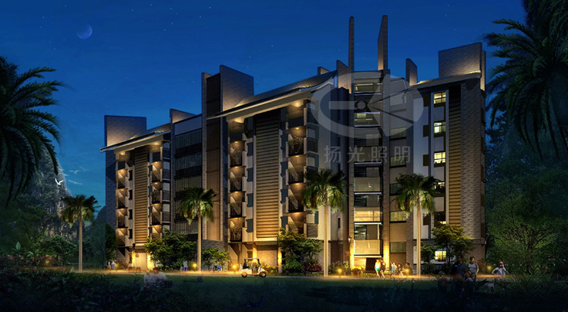 住宅燈光以靜謐的燈光氛圍為主,充分結合建筑特色,運用“點線面”燈光手法,強調建筑夜景特色。重點交代建筑頂部與入口在夜間的主次關系。
