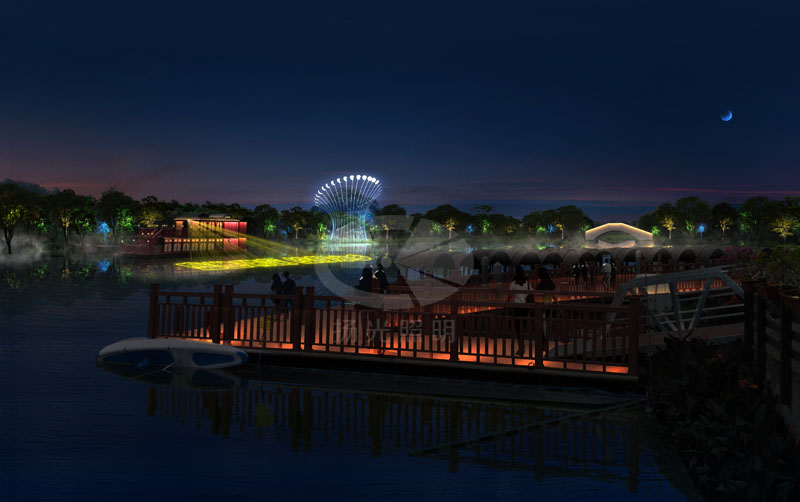 湖岸邊增加水上景觀雕塑——月相變換燈光雕塑,打造“荷塘月色水中映”的仙境。游船碼頭、水上棧道,在燈光設計上,兼顧功能性照明的同時,增添燈光色彩,打造七彩水上漫步之路。