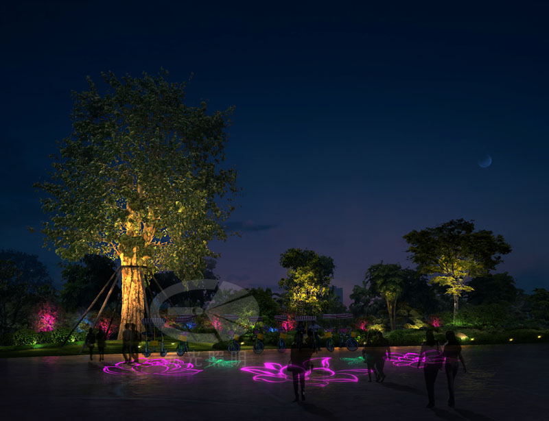 菩提大樹——特色互動照明,營造特色廣場夜環境。選用園區“水、蓮”元素作為燈光表現,呈現夜景園區文化。
