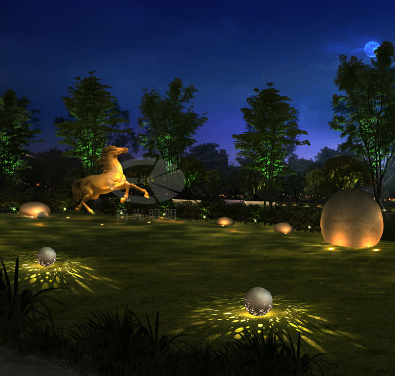 雕塑及景觀石使用投光燈照明,增加球形燈光雕塑呼應廣場上的景觀石,整合一體,豐富廣場夜間燈光效果。