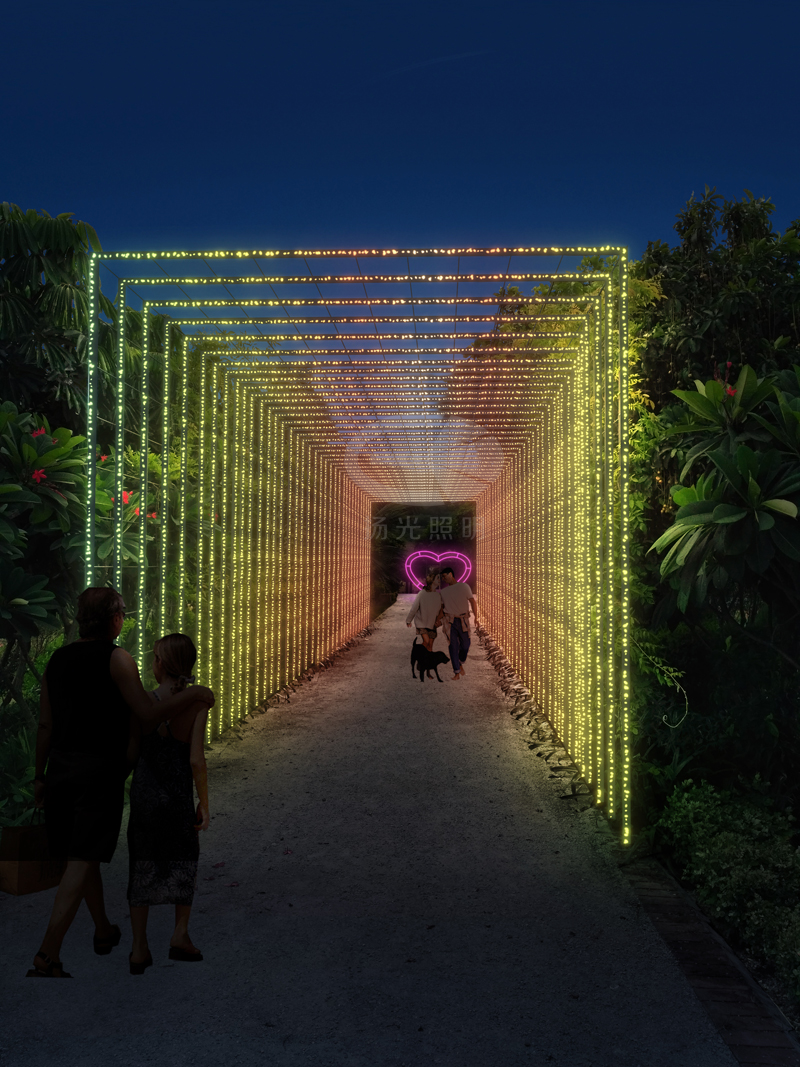 觀賞完心形架后,漫步走上連橋,會經過我們設計的燈光時空隧道,絢麗、夢幻的燈光效果,仿佛置身于愛情的時光隧道,穿越時空,感受牛郎織女凄美的愛情故事。