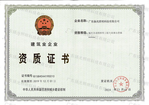 12月初,在廣東城鄉(xiāng)及住房建設(shè)廳領(lǐng)導(dǎo)的大力堅(jiān)持下,經(jīng)國家住房和城鄉(xiāng)建設(shè)部審查核準(zhǔn),揚(yáng)光照明取得“城市及道路照明工程專業(yè)承包壹級(jí)資質(zhì)”。
