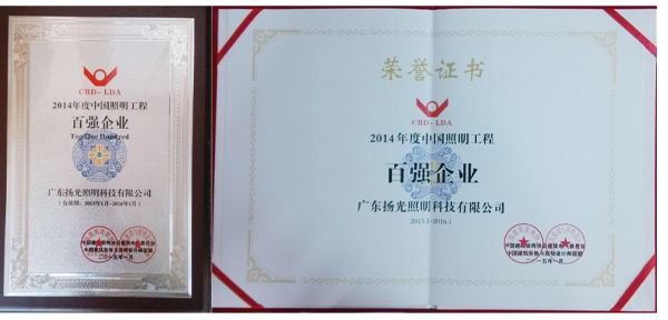 1月12日下午,由中國建筑裝飾協會建筑電氣委員會、《照明周刊》,中國建筑裝飾與照明設計師聯盟主辦的2014年度“中國照明工程公司百強企業”頒獎典禮及“第五屆中國LED照明應用峰會暨中國LED產業發展趨勢”在深圳中海凱驪酒店隆重召開。廣東揚光照明科技有限公司憑借雄厚的綜合實力、優質的照明工程質量及完善的售后服務,獲得2014年度“中國照明工程公司百強企業”榮譽稱號。