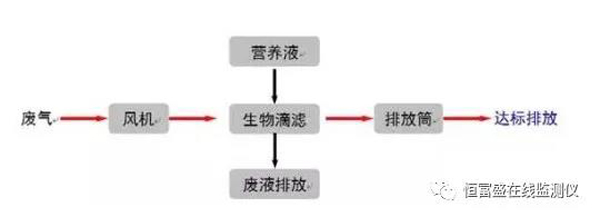 工藝流程以生物氧化為主、化學(xué)吸收為輔,主要通過生物處理去除廢氣中的絕大部分污染物,化學(xué)吸收單元?jiǎng)t可在進(jìn)氣濃度發(fā)生異常時(shí),為系統(tǒng)的穩(wěn)定達(dá)標(biāo)排放提供進(jìn)一步保證。主體技術(shù)生物滴濾箱由濾床、營(yíng)養(yǎng)液循環(huán)噴淋系統(tǒng)、參數(shù)控制系統(tǒng)等組成。廢氣進(jìn)入生物箱體后,通過附著在填料上的微生物的代謝作用,廢氣中的污染物被降解為簡(jiǎn)單的無機(jī)物。其中,VOCs分解為CO2、H2O以及其他簡(jiǎn)單的無機(jī)物;含氮污染物中的氮元素轉(zhuǎn)化為硝酸鹽或氮?dú)猓缓驉撼粑廴疚镏械牧蛟剞D(zhuǎn)化為硫酸鹽。