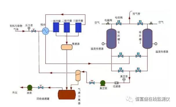 該技術(shù)采用多級(jí)冷凝技術(shù),使廢氣的有機(jī)成分在常壓下凝結(jié)成液體析出,經(jīng)凈化后的廢氣進(jìn)入吸附器進(jìn)一步吸附富集,同時(shí)確保達(dá)標(biāo)排放。吸附飽和后的吸附劑(活性炭、沸石等)等采用負(fù)壓脫附方式再生吸附劑,并將高濃度 VOCs 送回前端冷凝裝置。