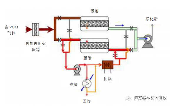 采用活性炭作為吸附劑,采用惰性氣體循環(huán)加熱脫附分流冷凝回收的工藝對(duì)有機(jī)氣體進(jìn)行凈化和回收。回收液通過后續(xù)的精制工藝可實(shí)現(xiàn)有機(jī)物的循環(huán)利用。工藝原理示意圖如下: